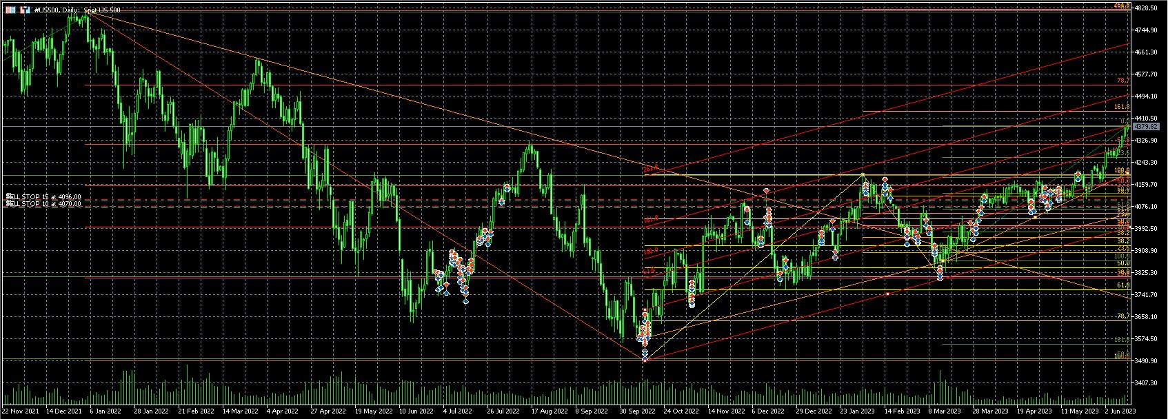 Hofheim am Taunus, 14.06.2023 – Die technische Analyse unseres US-amerikanischen Leitindex S&P 500 beschäftigt sich aktuell mit der Frage, bis zu welchem Kursniveau der aktuelle Aufwärtstrend noch laufen kann.