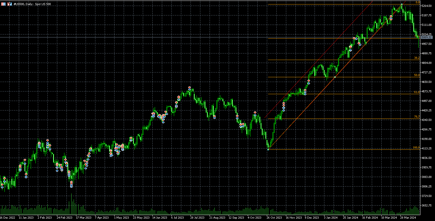 Der Aktienmarkt ist weiterhin im Korrekturmodus. Die erste potentielle und optimistischste Zielmarke bei 5000 Punkten wurde heute Nacht mit dem militärischen Gegenschlag Israels im Future bis runter auf 4925 Punkte gerissen. Aktuell läuft eine Kurserholung. Die nächsten Zielmarken lauten allerdings 4830 und 4690 Indexpunkte.