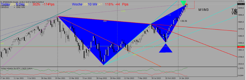 Derweil wuchs das Korrekturrisiko weiter an und zwischenzeitlich bildete sich ein bärisches Gartley (blau) im großen Bild (Wochenchart) heraus (Abbildung 2). Eine solche Formation zeigt mit hoher Eintrittswahrscheinlich einen Richtungswechsel der Kurse an. Doch der Markt lief erst einmal unbeirrt weiter und der Trendflow blieb im Gleichklang mit dem Sentiment im Extrembereich.