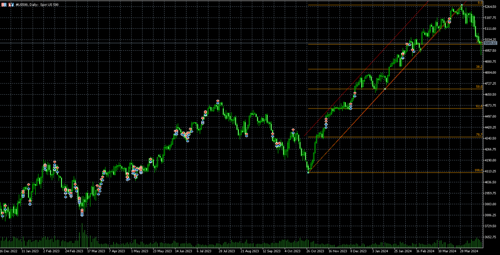 Die zweite Absicherungsebene folgte bei 5110 Punkten bzw. dem 50er Retracement. Der S&P 500 hatte dann am 10. und 12. April beide Marken gerissen. Die Absicherungsebenen zusammen führen zu einer Reduktion des Netto-Aktienanteils von 62 auf zunächst 40 Prozent.