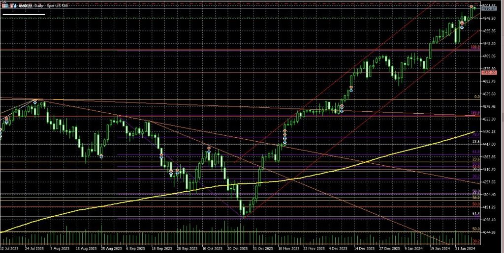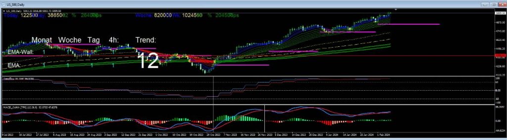Hofheim am Taunus, den 08.02.2024 – Die Aktienmärkte sind im Steigflug begriffen und erreichen zum Teil gerade neue Allzeithochs, wie der S&P 500. Bereits seit Oktober bewegt sich der Index in seinem Kanal (roter Kanal in Abbildung 1) nach oben. Diese Entwicklungen wirken entsprechend positiv für den zaldor Core Portfolio RG. Wir nehmen sie gerne mit auf. Solche Hausse-Phasen verlaufen nie auch ohne Warnsignale. Man könnte das als normal abtun und sich deshalb sorgenfrei zurücklehnen und dem Trend weiter hinterherschauen.