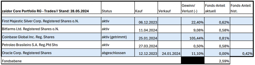 Die Trades haben im Augenblick einen Anteil von etwa 2,6 Prozent am Fonds. Sie bestehen aus vier Positionen. Mit dem bereits abgeschlossenen Oracle-Trade sind es insgesamt fünf Trades seit Fondsauflage. Aufsichtsrechtliche Vorgaben untersagen im ersten Jahr kumulierte Renditeangaben von Fondsteilen, wie unserem Trading-Teil. Lediglich die Renditen einzelner Positionen dürfen kommuniziert werden. Tabelle 1 listet die Positions-Trades. Der Coinbase Global Trade sticht mit einer Rendite von +105,44 % (Stand 28.05.2024) positiv heraus. Die Position wurde zwischenzeitlich um etwa ein Viertel getrimmt und Gewinne mitgenommen. Inklusive dieser realisierten Gewinne liegt die Rendite des Trades bei +128,53 %.