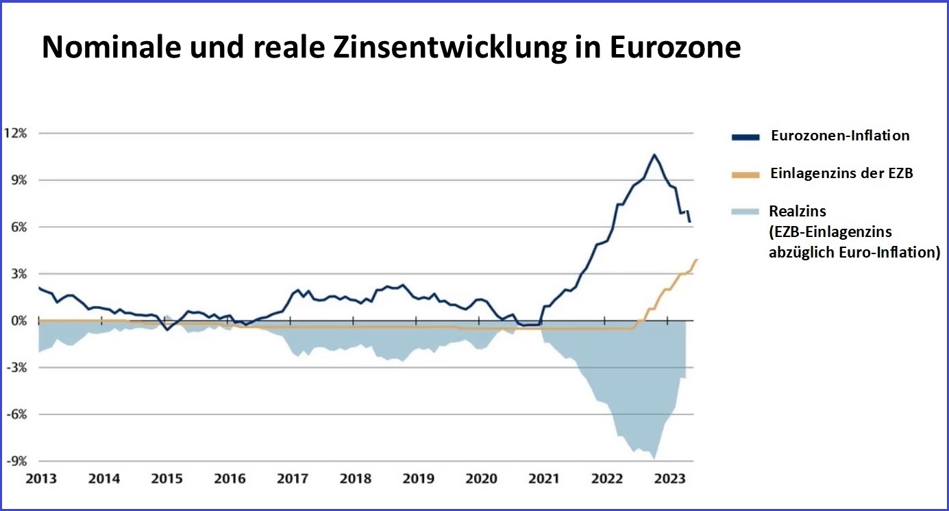 Eine schwankungsfreie Geldanlage, in Form eines Festgelds mit derzeit etwa 3 Prozent Verzinsung p.a. und 3 Jahren Laufzeit, hinterlässt bei vielen Sparern den Eindruck einer Anlage mit auskömmlicher Rendite. Doch Wahrnehmung und Wirklichkeit klaffen auseinander. Gemessen in realer Kaufkraft führt diese Anlage bei aktuell 6 Prozent Teuerung jedes Jahr in den Verlust. Bleibt es bei dieser Teuerungsrate, ergeben 3 Jahre dieser, aus Sicht der Finanzaufsicht sicheren Geldanlage, fast 10 Prozent Verlust. Abbildung 2 zeigt, mit der Entwicklung der realen Verzinsung, dass diese Scheinsicherheit derzeit besonders irreführend ist.
